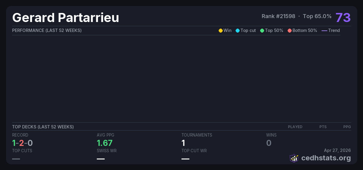| Tournament | Deck | Result | Record | PPG | Points ? |