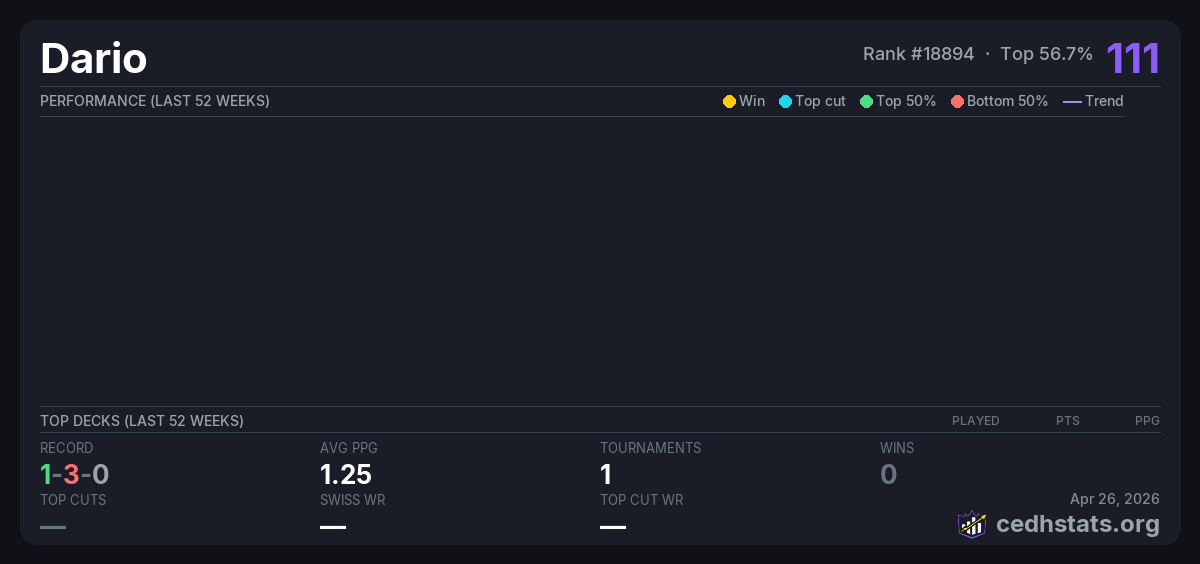 | Ludik 17/10 Commander Oct 18, 2025 | Invalid pairing | 3/16 | 1-3-0 | 111 |