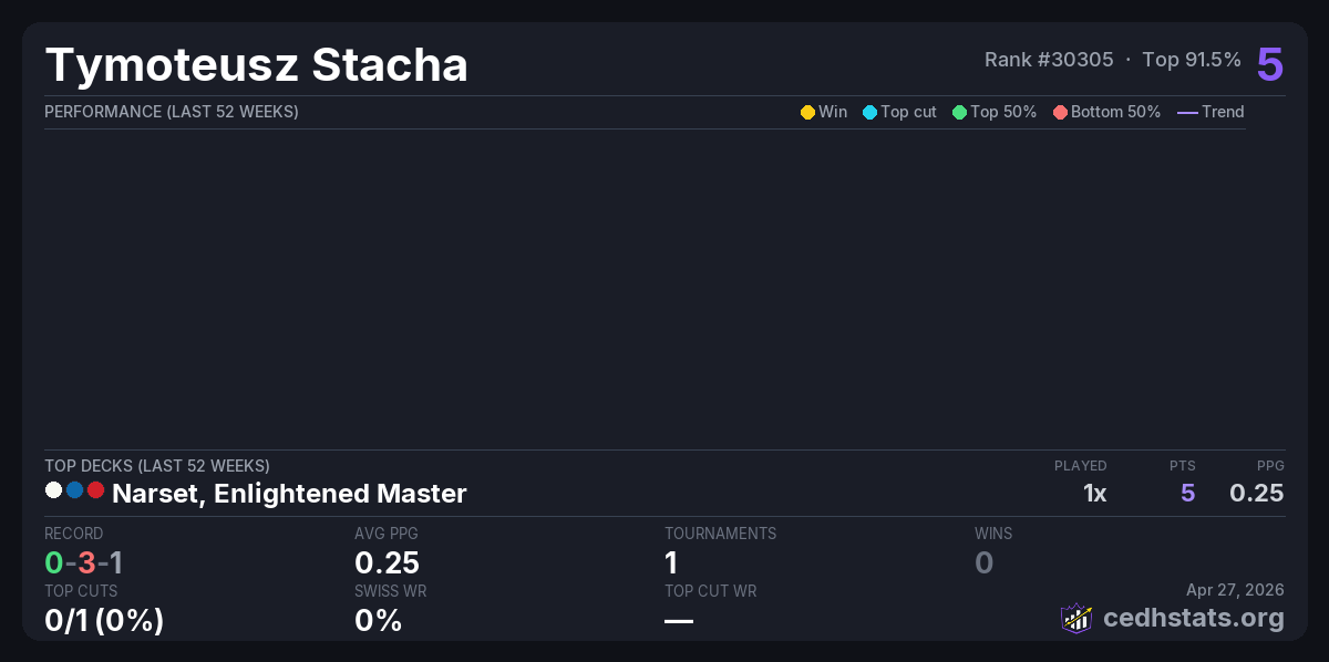 | cEDH Poznan #7: Breach & Breakfast vol. 1 Apr 25, 2026 · 28 players | Narset, Enlightened Master | 26/28 | 0-3-1 | 0.25 | 5 |