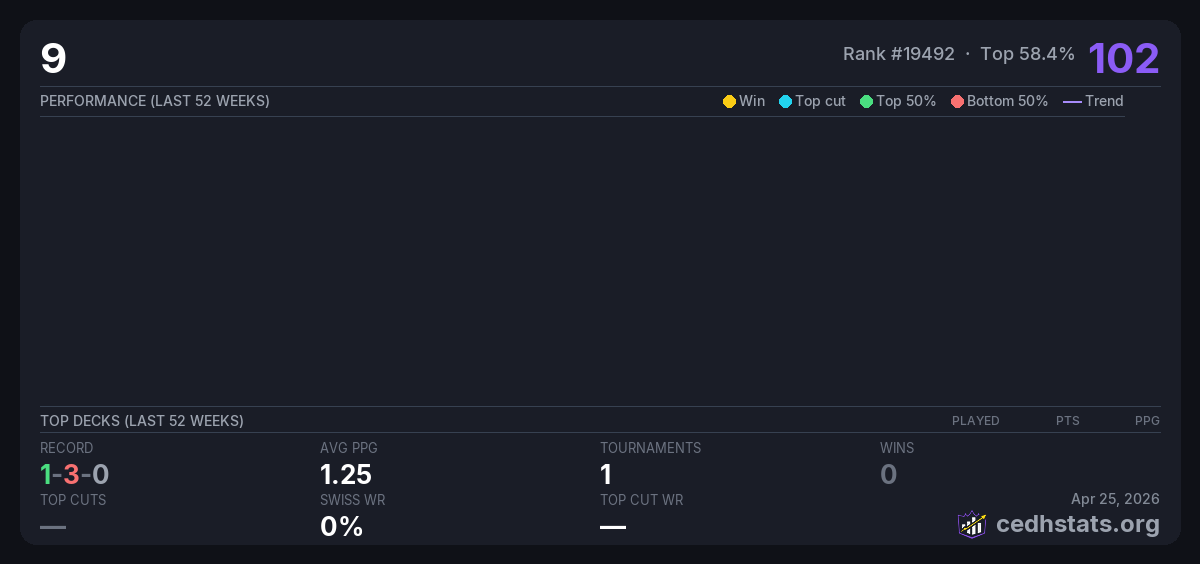 | Tournament | Deck | Result | Record | PPG | Points ? |
