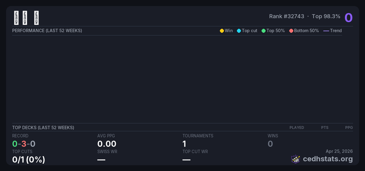 | 2月8日 CEDH月赛 Feb 08, 2026 · 26 players | 26/26 | 0-3-0 | 0.00 | 0 |