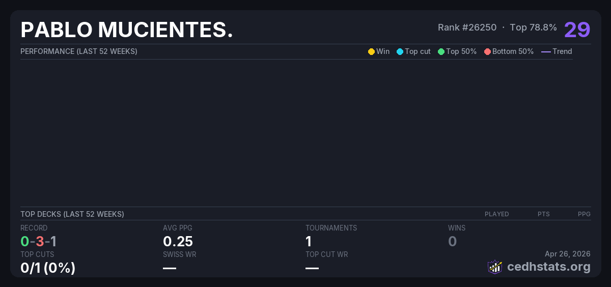 | CEDH HAMMER TCG STORE Sep 27, 2025 · 20 players | Invalid pairing | 14/20 | 0-3-1 | 0.25 | 29 |