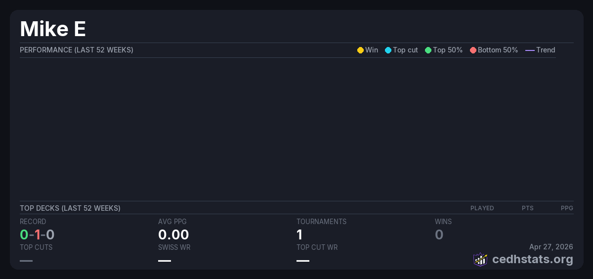 | Casual Saturday Commander - Obsidian Games Mar 08, 2026 · 18 players | 18/18 | 0-1-0 | 0.00 | — |