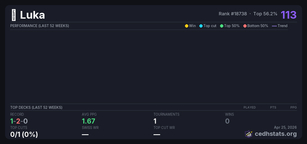 | 8月10日 CEDH月赛 Aug 10, 2025 · 32 players | Invalid pairing | 13/32 | 1-2-0 | 1.67 | 113 |