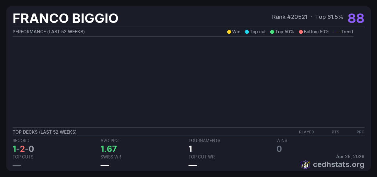 | CYDH May 29, 2025 · 20 players | Invalid pairing | 9/20 | 1-2-0 | 1.67 | 88 |