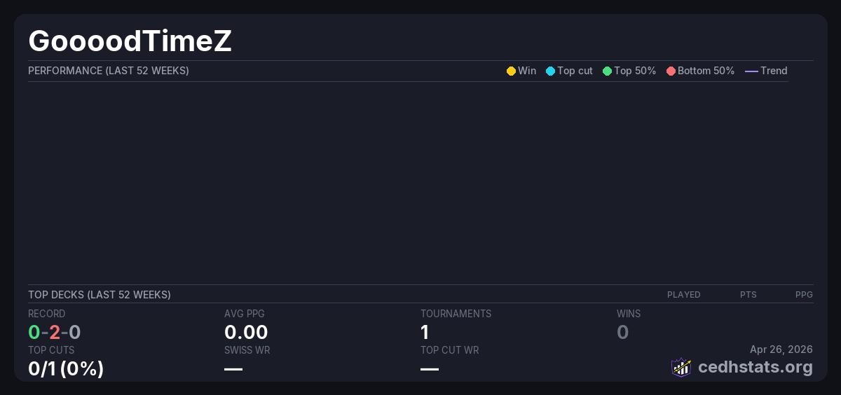 | Giving Thanks and Taking Names Nov 27, 2025 · 28 players | Invalid pairing | 24/28 | 0-2-0 | 0.00 | — |
