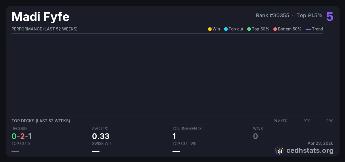 | Tournament | Deck | Result | Record | PPG | Points ? |