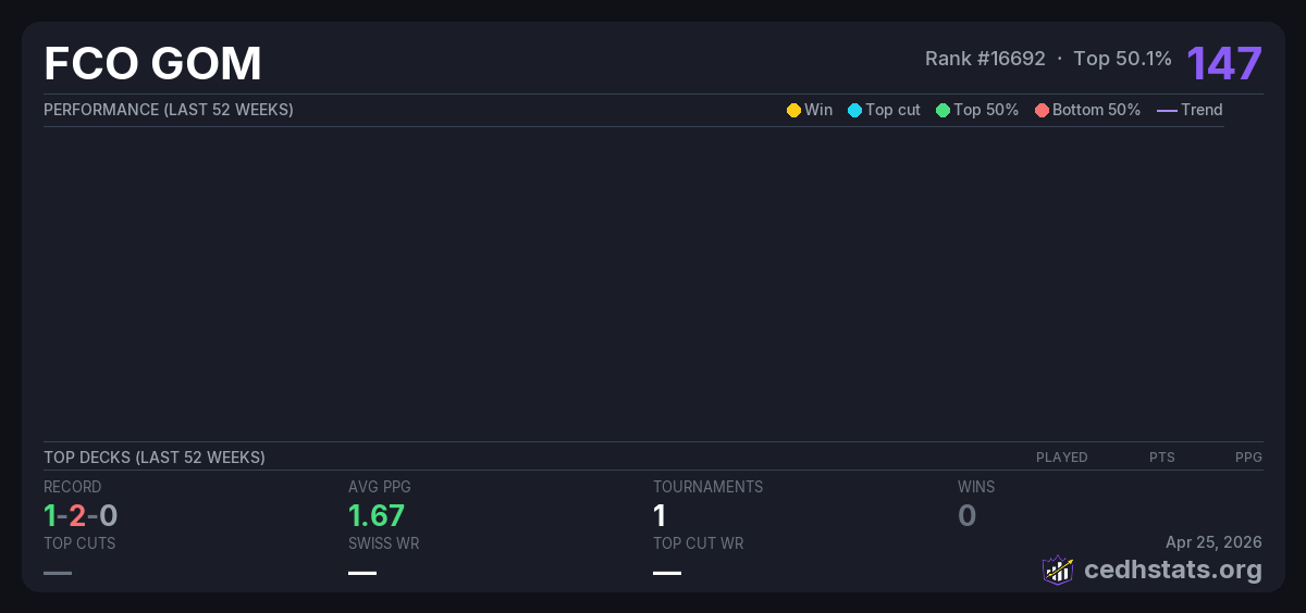 | CEDH Oct 09, 2025 · 24 players | Invalid pairing | 7/24 | 1-2-0 | 1.67 | 147 |