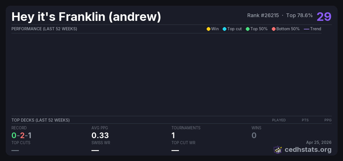 | Commander League 3 week 2 Feb 07, 2026 · 20 players | 14/20 | 0-2-1 | 0.33 | 29 |