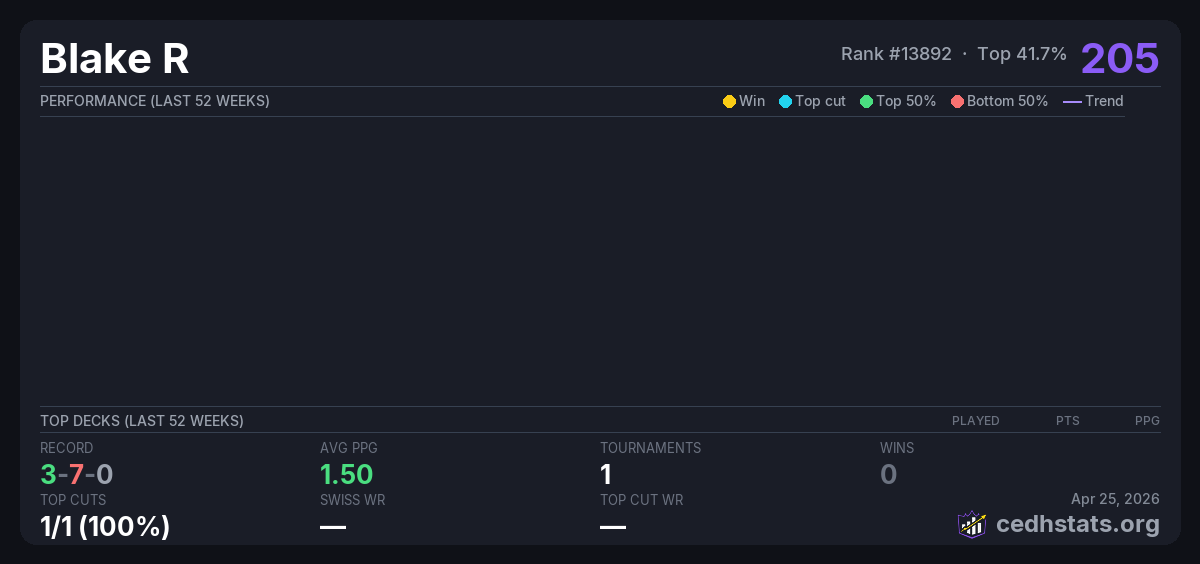 | The Iron Lion January CEDH League Jan 07, 2026 · 22 players | — | 4/22 | 3-7-0 | 1.50 | 205 |