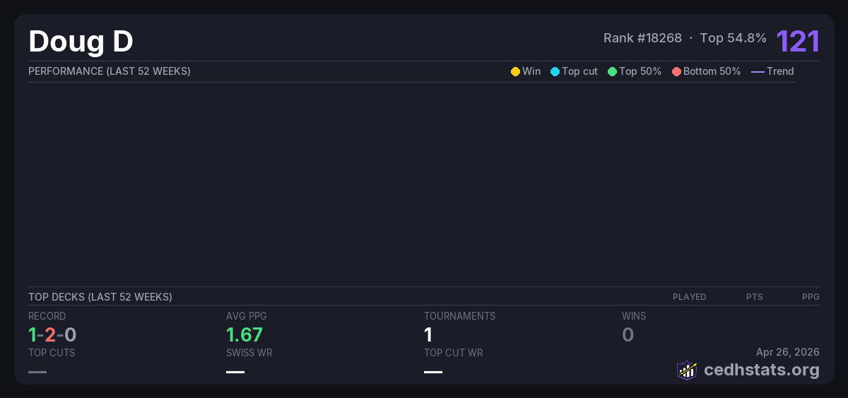 | FNM EDH 12-5-25 Dec 05, 2025 · 20 players | 7/20 | 1-2-0 | 1.67 | 121 |