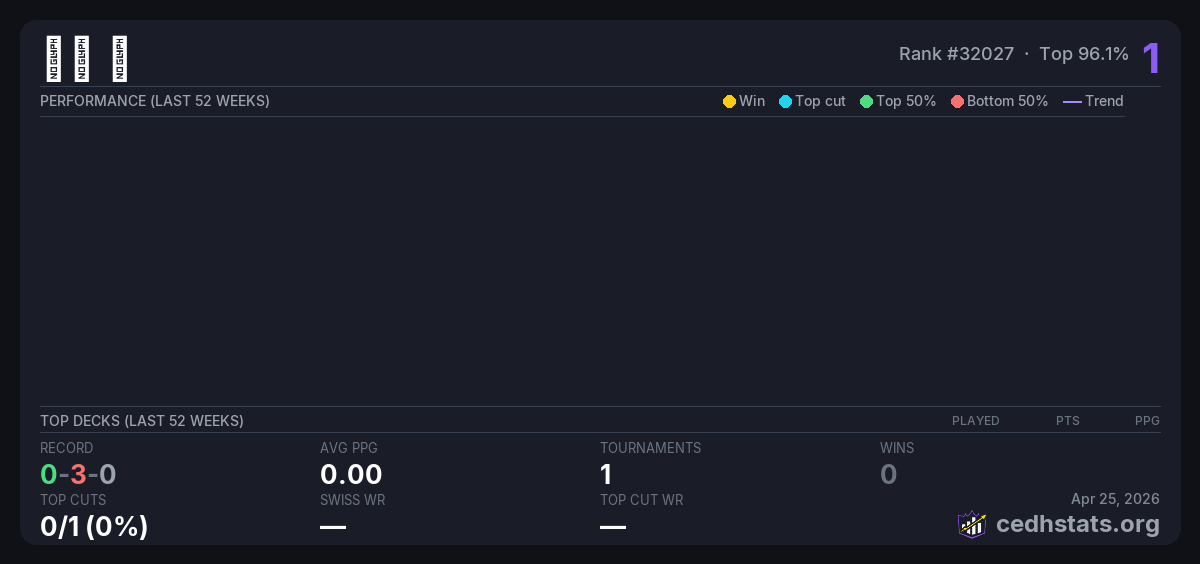 | 8月10日 CEDH月赛 Aug 10, 2025 · 32 players | Invalid pairing | 31/32 | 0-3-0 | 0.00 | 1 |