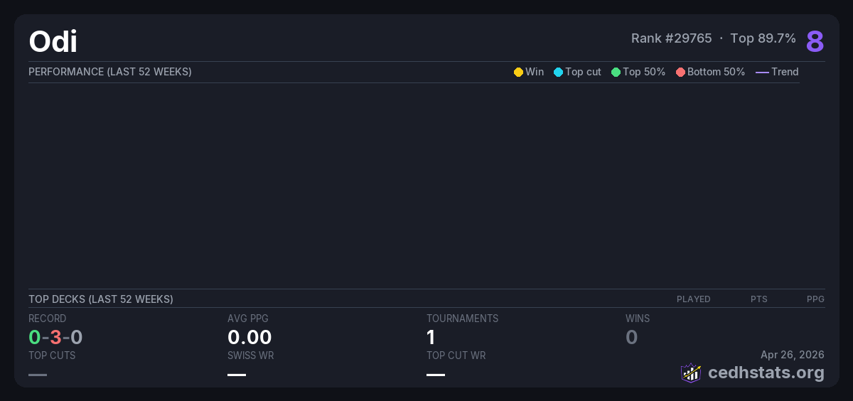 | Commander Bracket 3 @Kosa, by Play Inside Jun 14, 2025 · 16 players | Invalid pairing | 14/16 | 0-3-0 | 0.00 | 8 |
