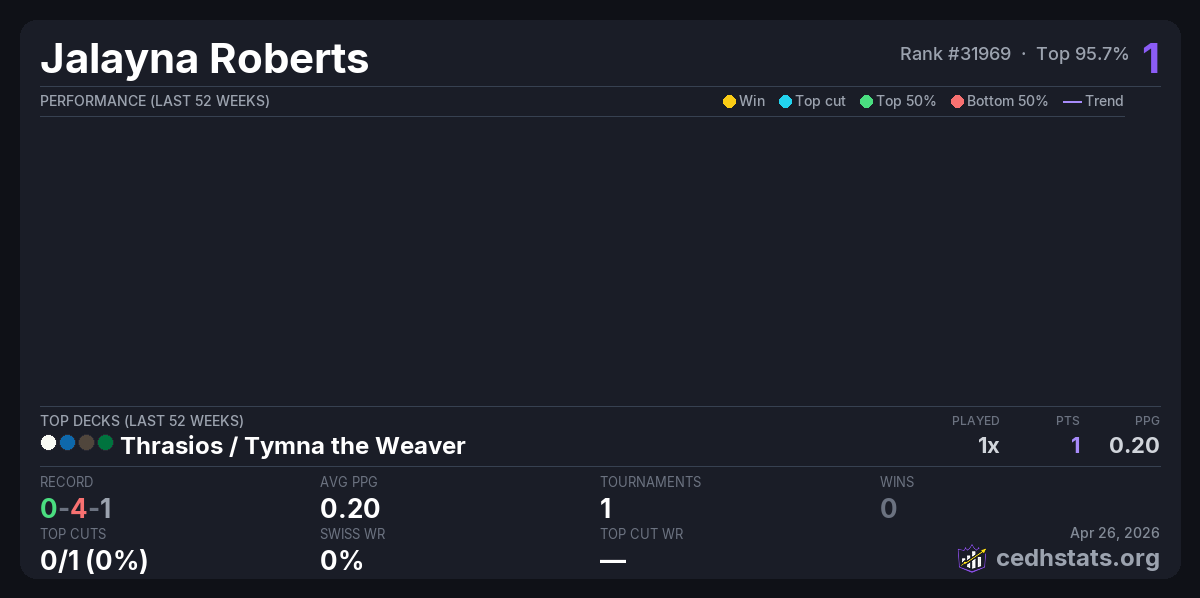 | Recycled Entertainment Dual Land CEDH Tournament Apr 25, 2026 · 35 players | Thrasios / Tymna | 34/35 | 0-4-1 | 0.20 | 1 |