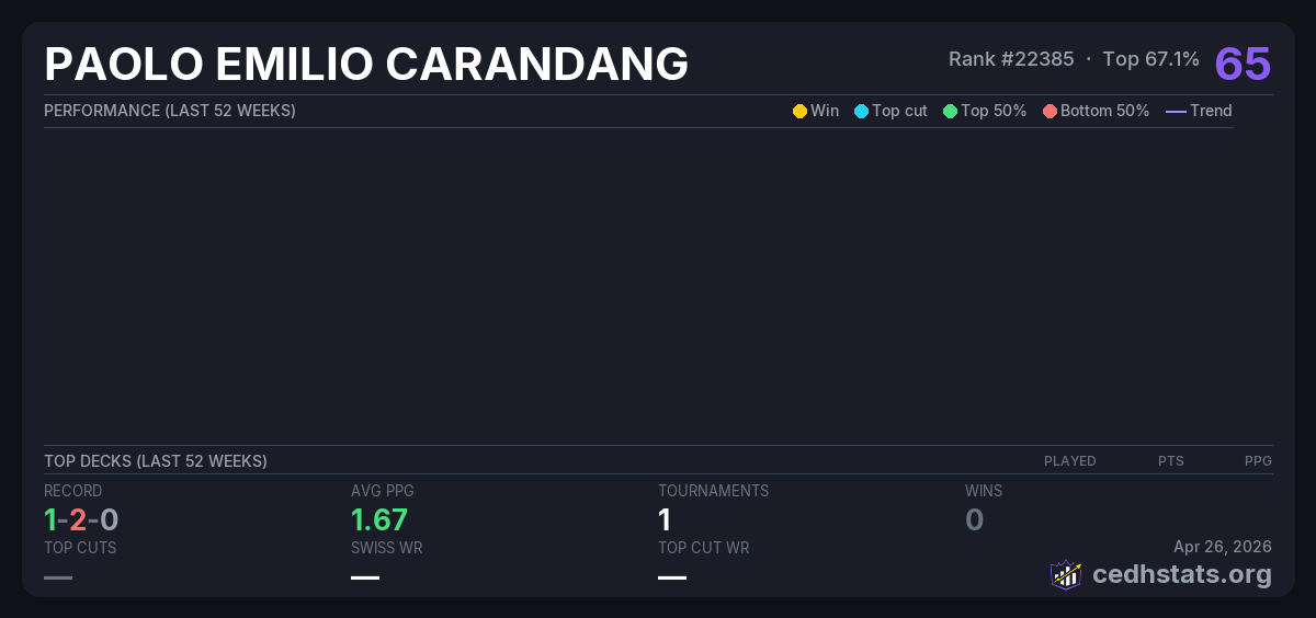 | $100 Commander Multi Jul 13, 2025 · 18 players | Invalid pairing | 10/18 | 1-2-0 | 1.67 | 65 |