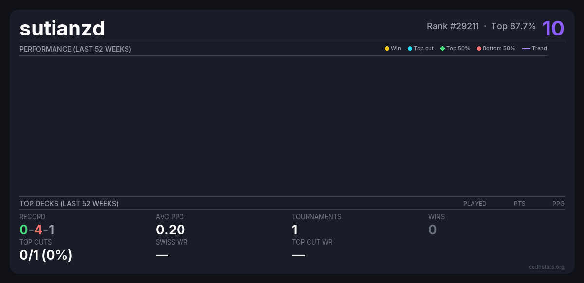 | Command Fest Shanghai 250524 May 24, 2025 · 93 players | Invalid pairing | 79/93 | 0-4-1 | 0.20 | 10 |