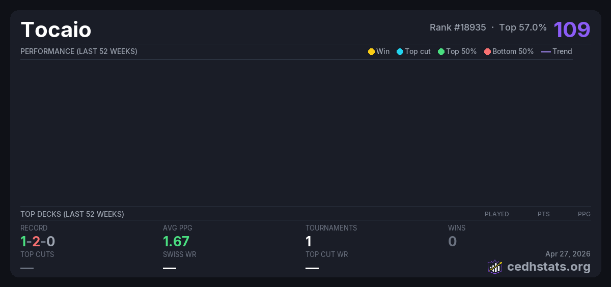 | Magic 2.0 #1 May 23, 2025 · 16 players | Invalid pairing | 6/16 | 1-2-0 | 1.67 | 109 |