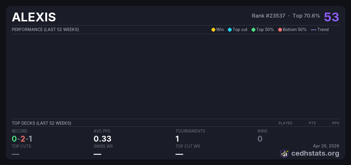 | Tournament | Deck | Result | Record | PPG | Points ? |