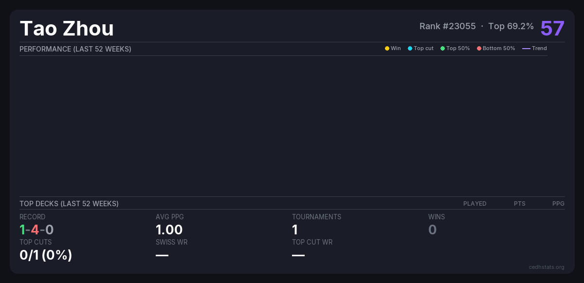 | 2025.10.25 广州CF cEDH Oct 25, 2025 · 80 players | Invalid pairing | 50/80 | 1-4-0 | 1.00 | 57 |