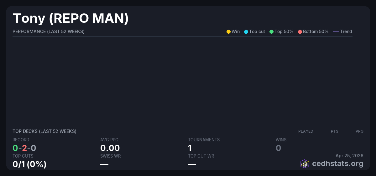 | Manic Monday Dec 23, 2025 · 30 players | 21/30 | 0-2-0 | 0.00 | — |