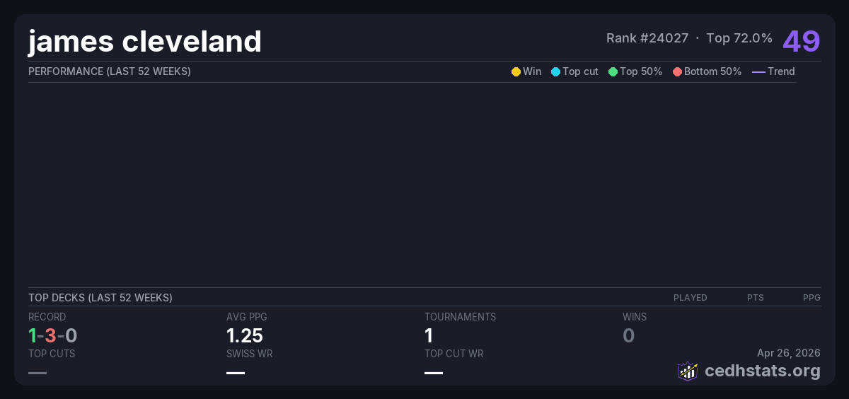 | Draft Pick Commander Jan 10, 2026 | 11/17 | 1-3-0 | 49 | |