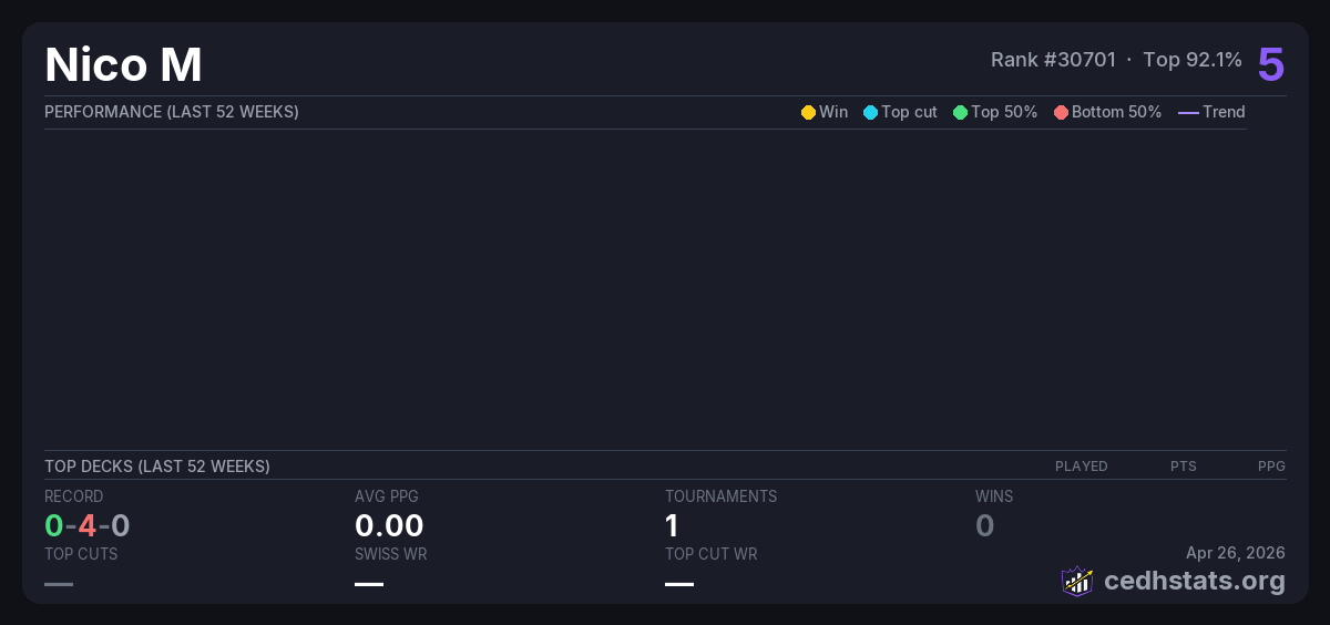 | Torneo 21/9 Sep 21, 2025 | Invalid pairing | 14/16 | 0-4-0 | 5 |