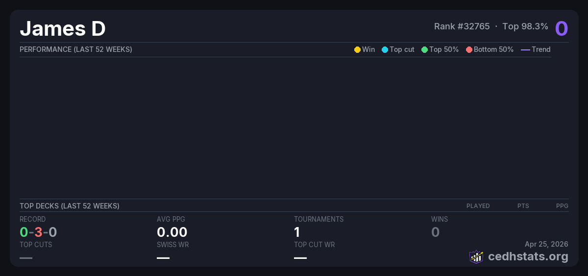 | Unaltered Precon Oct 12, 2025 · 26 players | Invalid pairing | 26/26 | 0-3-0 | 0.00 | 0 |