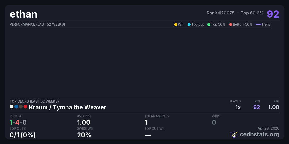 | Shuffle N Roll's cEDH Dual Land Tournament Apr 25, 2026 · 52 players | Kraum / Tymna | 33/52 | 1-4-0 | 1.00 | 92 |