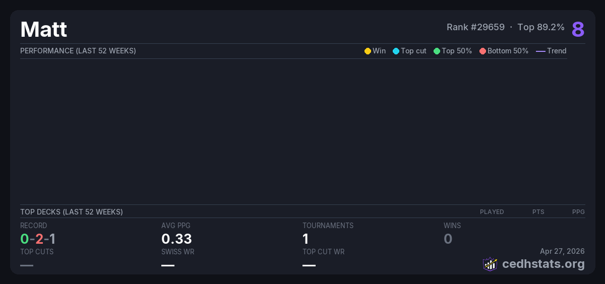 | Commander Precon League 2 Week 6 Sep 27, 2025 · 18 players | Invalid pairing | 16/18 | 0-2-1 | 0.33 | 8 |