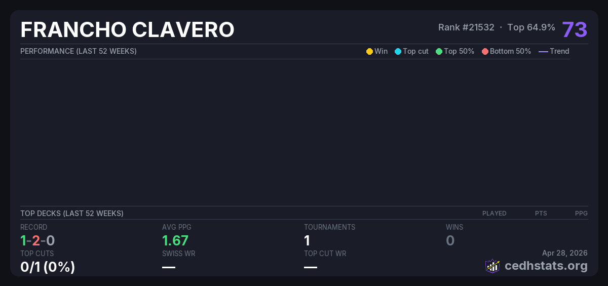 | Pruebota commandancias Sep 28, 2025 · 21 players | Invalid pairing | 11/21 | 1-2-0 | 1.67 | 73 |