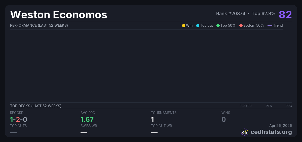 | Bracket 3 Mar 08, 2026 · 26 players | 14/26 | 1-2-0 | 1.67 | 82 |