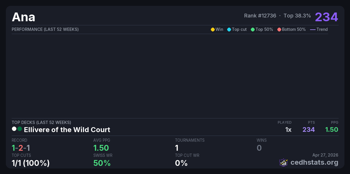 | Bcedh Magic Events Apr 25, 2026 · 22 players | Ellivere of the Wild Court | 6/22 | 1-2-1 | 1.50 | 234 |