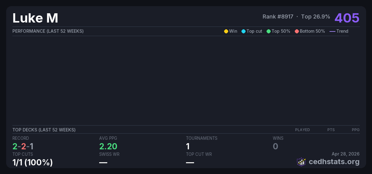 | Tournament | Deck | Result | Record | PPG | Points ? |
