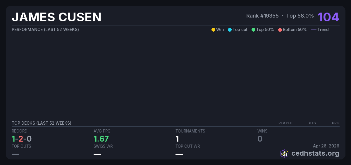 | CEDHI May 08, 2025 | Invalid pairing | 8/20 | 1-2-0 | 104 |