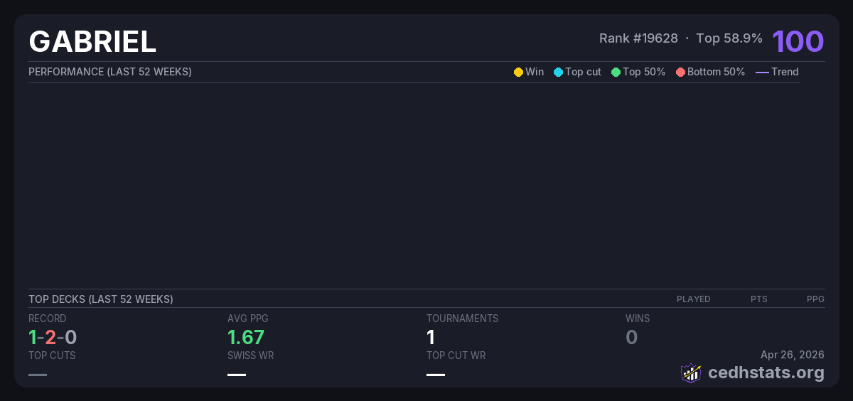 | cedh Jul 10, 2025 · 20 players | Invalid pairing | 8/20 | 1-2-0 | 1.67 | 100 |