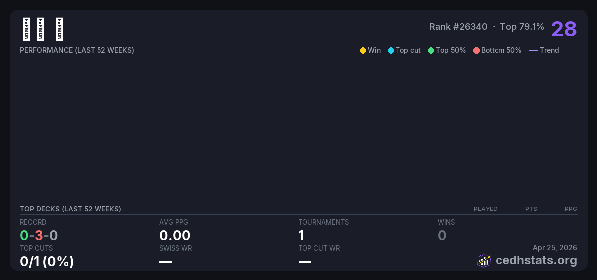 | 9月14日 CEDH月赛 Sep 14, 2025 · 24 players | Invalid pairing | 17/24 | 0-3-0 | 0.00 | 28 |