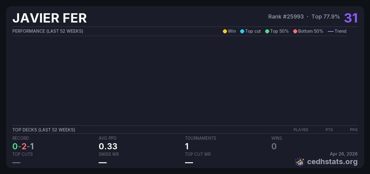 | CEDHxs Nov 27, 2025 · 16 players | Invalid pairing | 11/16 | 0-2-1 | 0.33 | 31 |