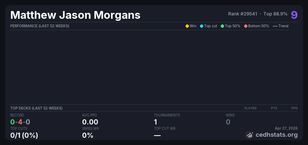 | SCRUBLAND | URZA'S DESTINY | STRIXHAVEN BOX | April CEDH Tournament Apr 25, 2026 · 27 players | — | 24/27 | 0-4-0 | 0.00 | 9 |