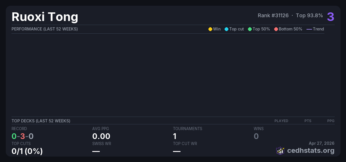 | 1月25日 CEDH月赛 Jan 25, 2026 · 28 players | 26/28 | 0-3-0 | 0.00 | 3 |