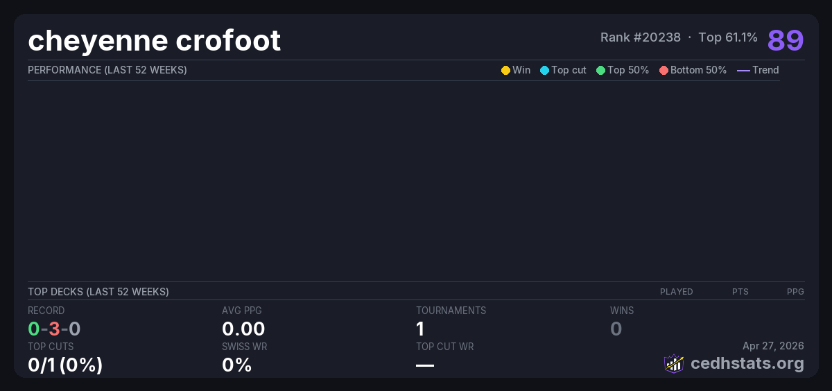 | Twisted Power - Midwest Gaming Classic TimeTwister Tournament Apr 25, 2026 · 172 players | — | 118/172 | 0-3-0 | 0.00 | 89 |