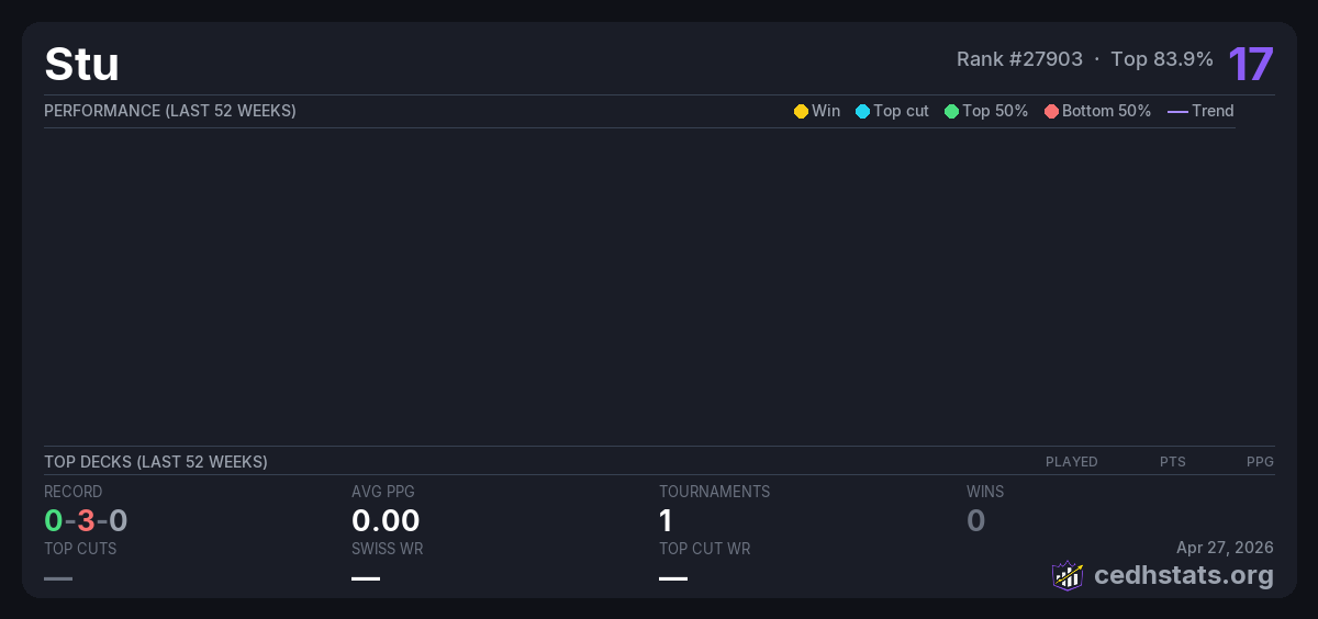 | Jake's B'Day CEDH Jan 24, 2026 · 16 players | 13/16 | 0-3-0 | 0.00 | 17 |