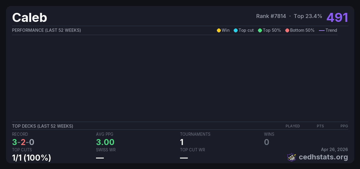 | CEDH Proxy Friendly Hive Tournament Sep 14, 2025 | Invalid pairing | 2/21 | 3-2-0 | 491 |