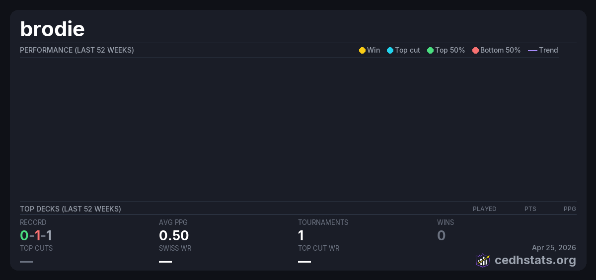| Thursday Night Commander 2 4 26 Apr 02, 2026 · 26 players | 14/26 | 0-1-1 | 0.50 | — |