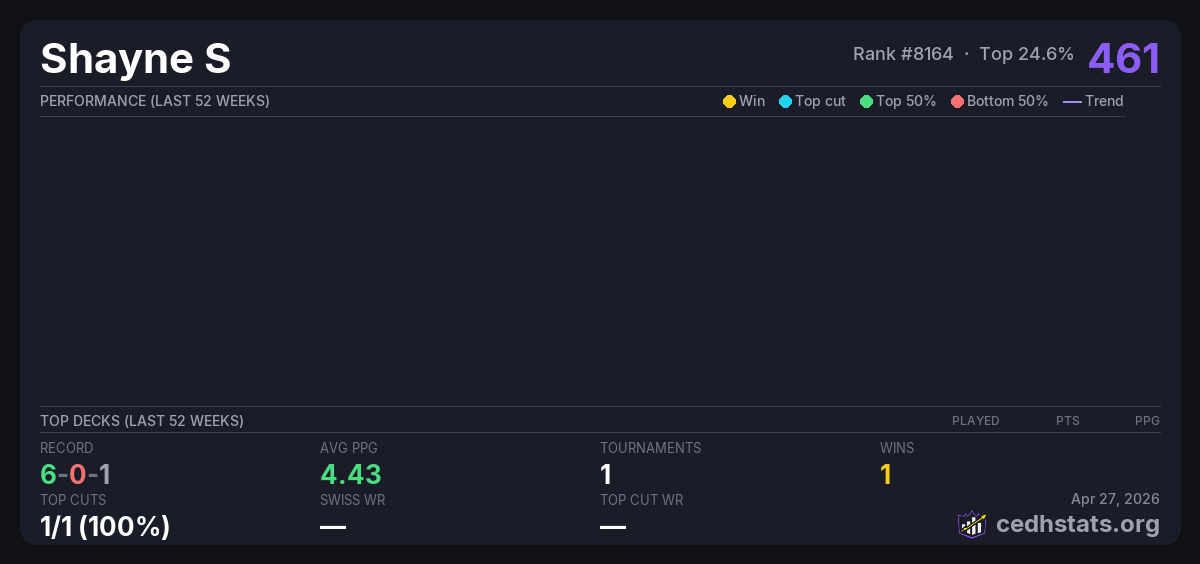 | Iron Lion June CEDH League Jun 04, 2025 · 17 players | — | 1/17 | 6-0-1 | 4.43 | 461 |