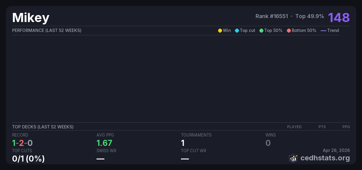 | Tournament | Deck | Result | Record | PPG | Points ? |