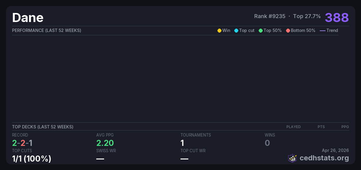 | Tournament | Deck | Result | Record | PPG | Points ? |