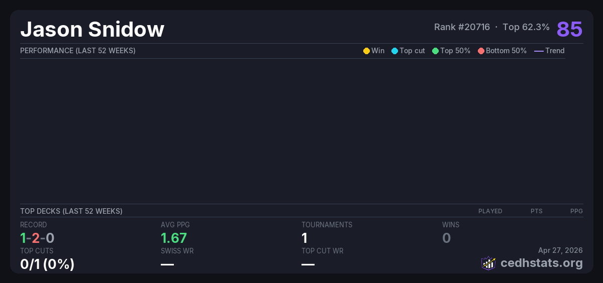 | Commander Championship May 17, 2025 · 20 players | Invalid pairing | 9/20 | 1-2-0 | 1.67 | 85 |