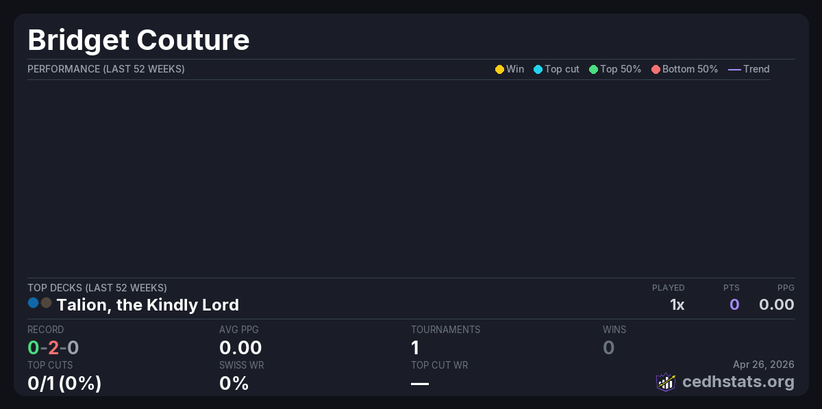 | Game On Win-A-Vault Cedh April 25th Apr 25, 2026 · 43 players | Talion, the Kindly Lord | 39/43 | 0-2-0 | 0.00 | — |