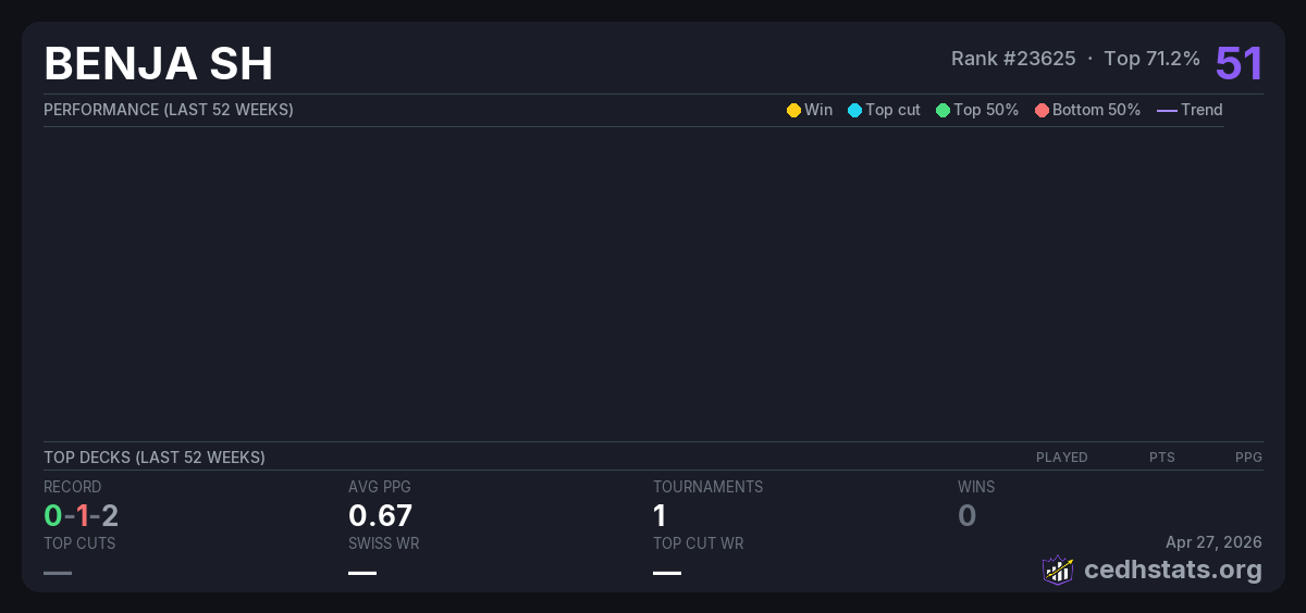 | PARARA Aug 19, 2025 · 16 players | Invalid pairing | 9/16 | 0-1-2 | 0.67 | 51 |