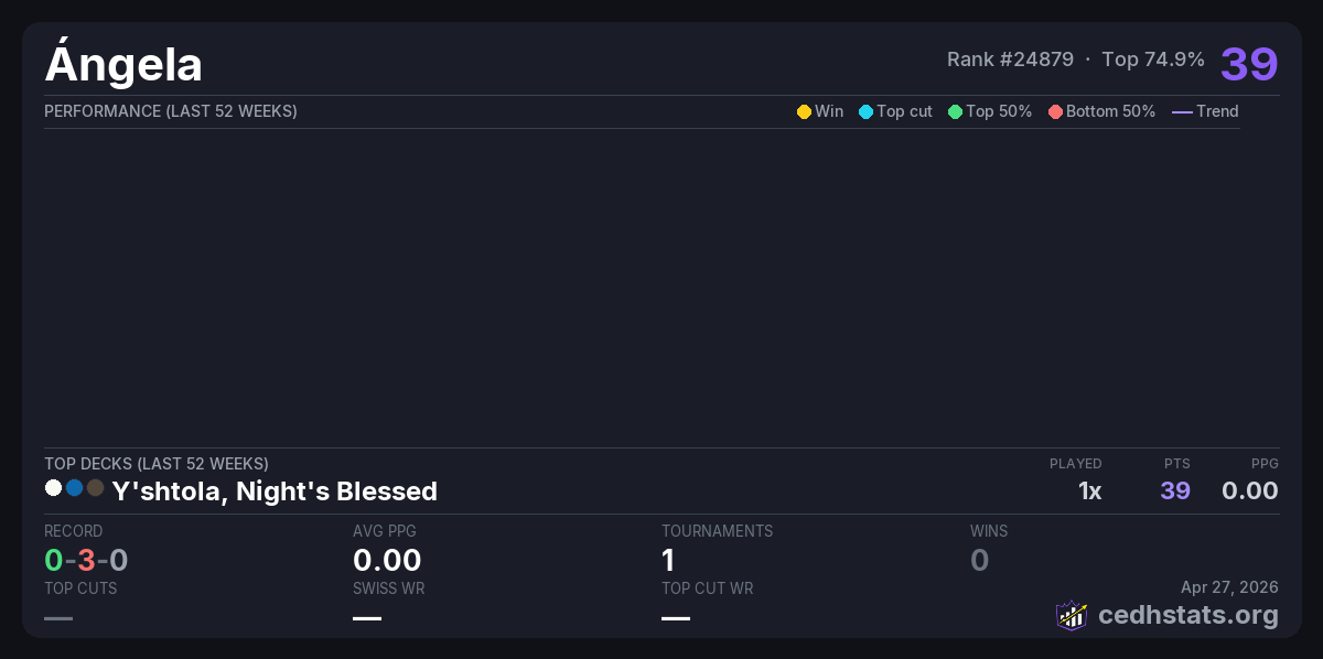 | BATALLA DE PRECON ( ESPECIAL STRIXHAVEN ) Apr 26, 2026 · 19 players | Y'shtola, Night's Blessed | 11/19 | 0-3-0 | 0.00 | 39 |